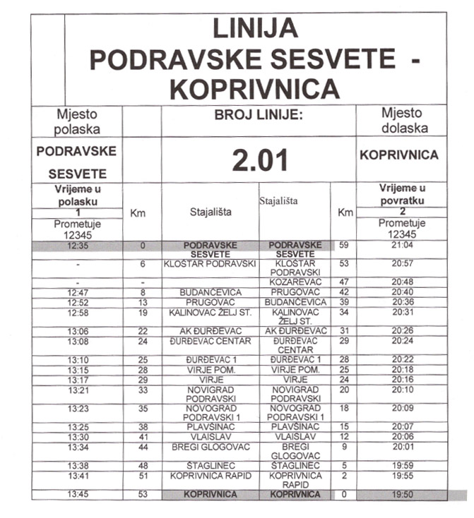 Vozni red - Linija - Podravske Sesvete - Koprivnica
